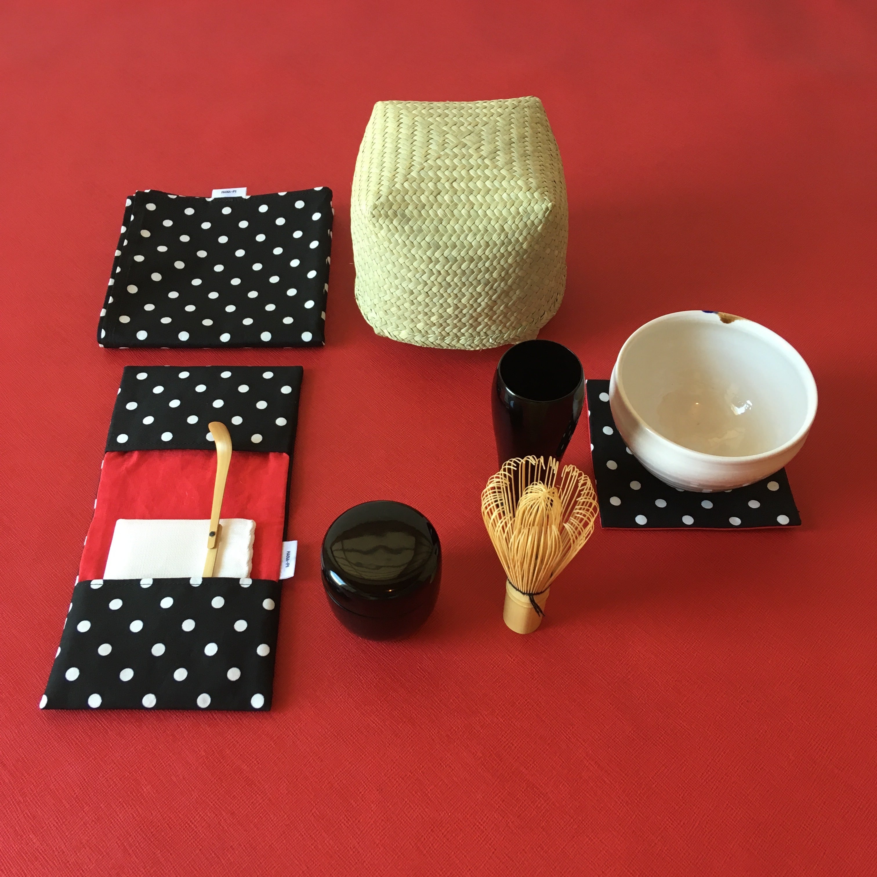 ドットの風呂敷と懐中ケースが茶籠のアクセント。